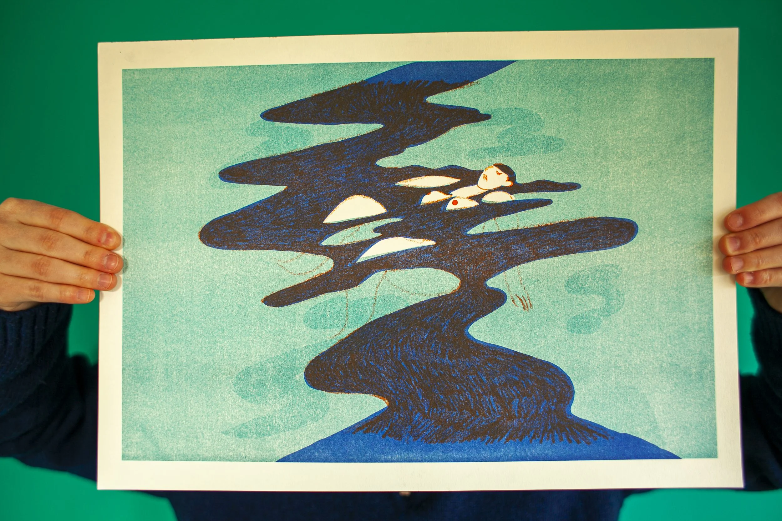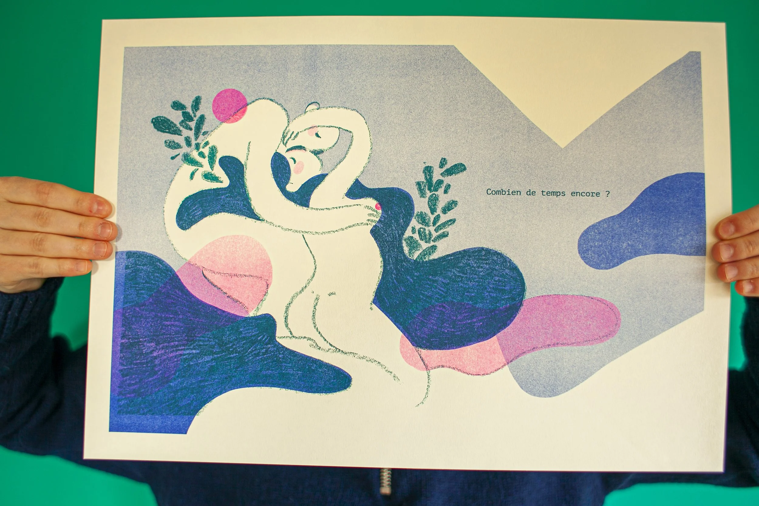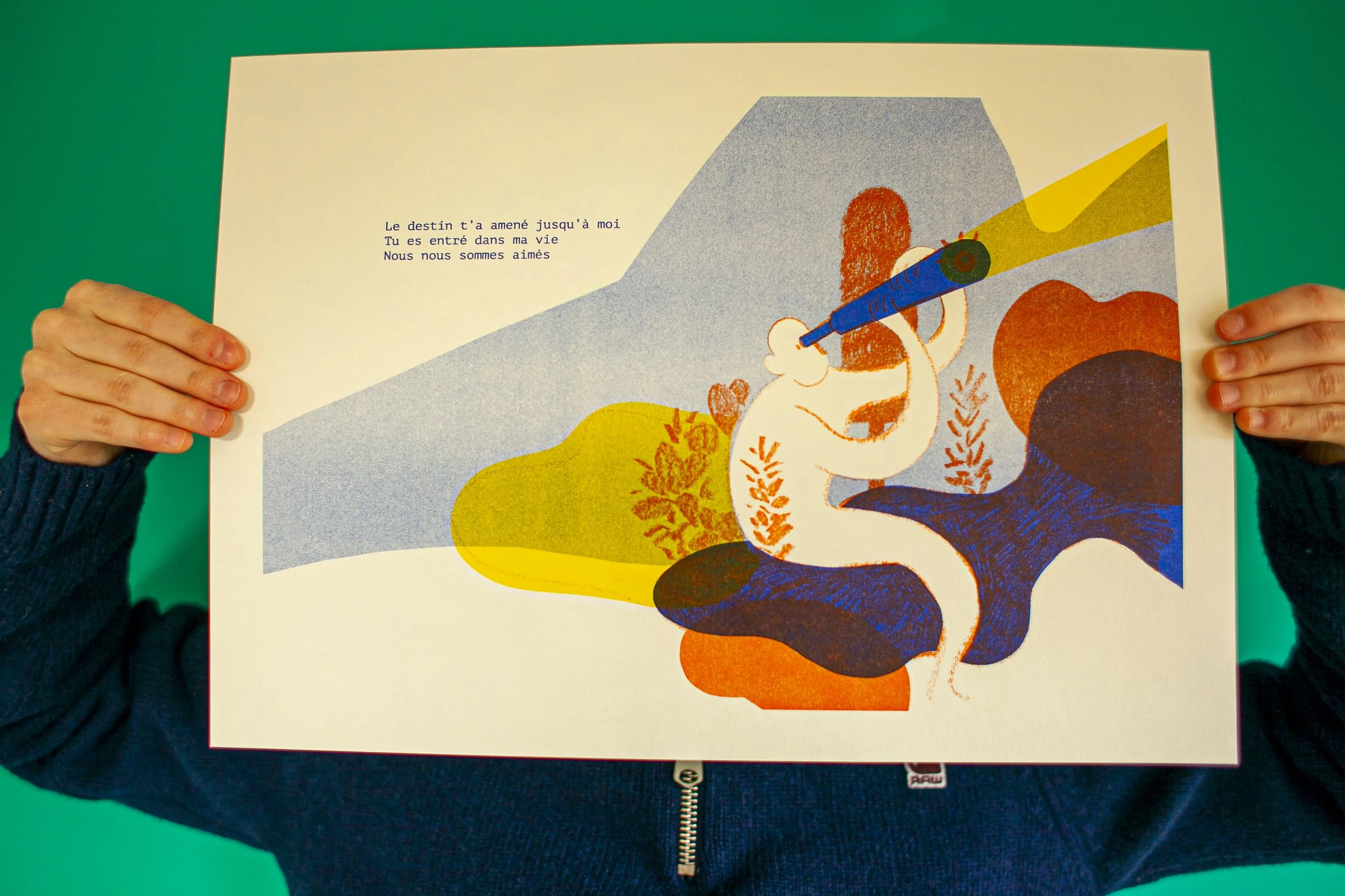 Dans l’optique de vouloir tester différentes techniques, j’ai imprimé mon projet en risographie chez Rosi à Bruxelles. Cette technique d’impression se caractérise par une esthétique particulière et unique , reposant sur la superposition des couleurs. Avec un rendu tramé à l’accent artisanal, le résultat obtenu est similaire à la sérigraphie.