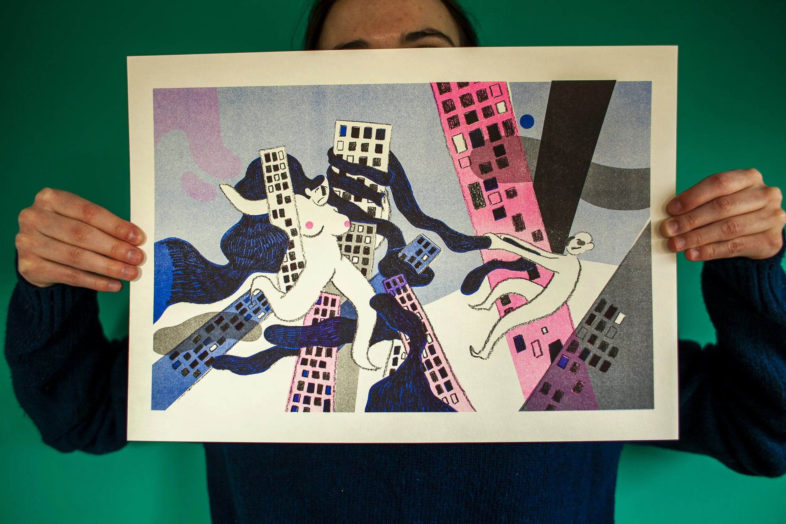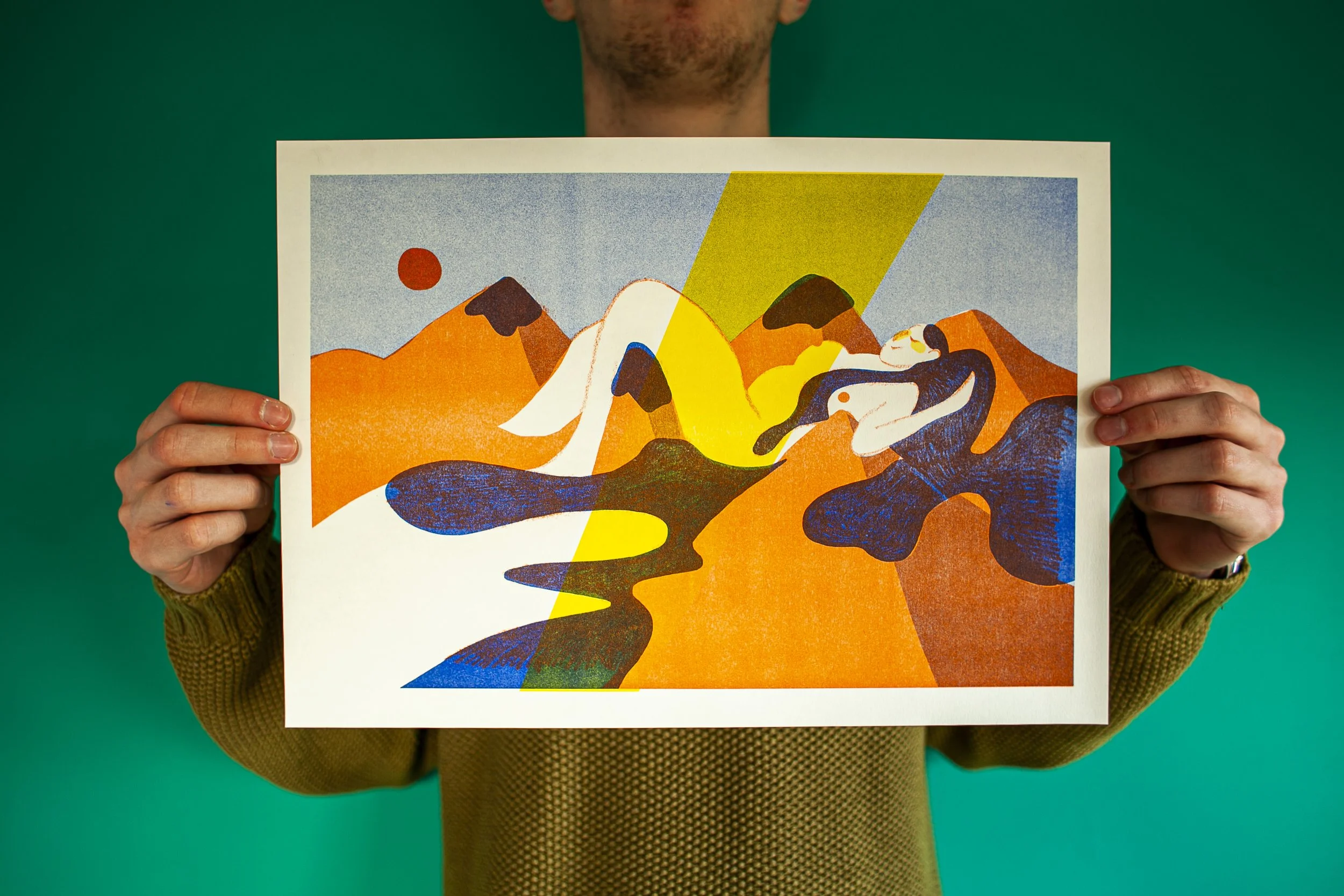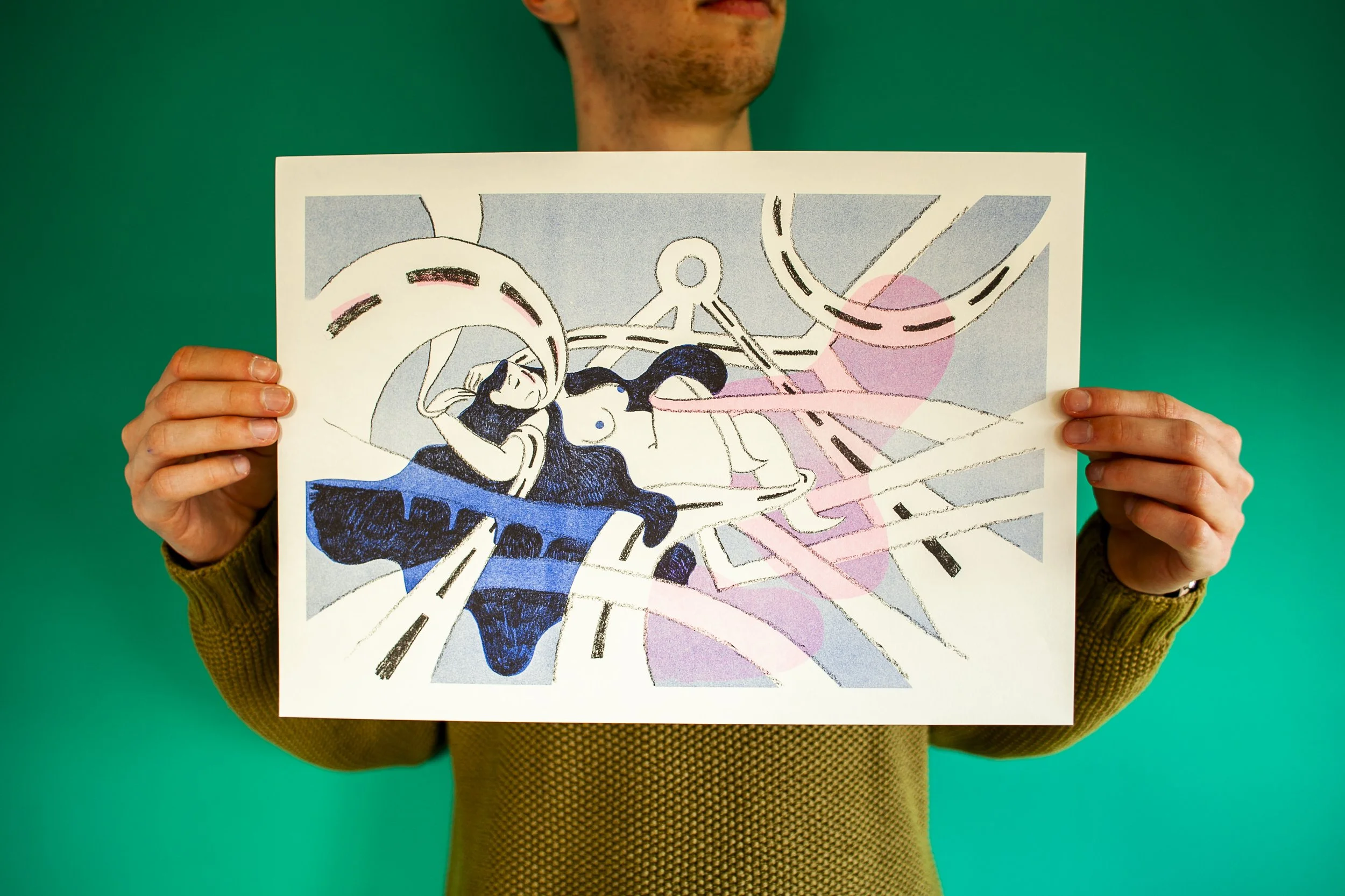 Dans l’optique de vouloir tester différentes techniques, j’ai imprimé mon projet en risographie chez Rosi à Bruxelles. Cette technique d’impression se caractérise par une esthétique particulière et unique , reposant sur la superposition des couleurs. Avec un rendu tramé à l’accent artisanal, le résultat obtenu est similaire à la sérigraphie.